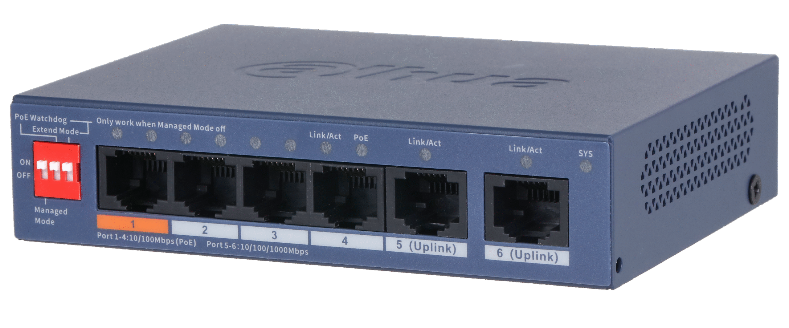 Πορτοκαλί θύρα: Η πρώτη θύρα στο Switch μπορεί να τραβήξει τροφοδοσία 60W για να τροφοδοτήσει κάποια PTZ ή άλλη συσκευή που χρειάζεται Hi-PoE ή PoE+. Σε αυτή την περίπτωση οι υπόλοιπες θύρες δεν δίνουν τροφοδοσία PoE.